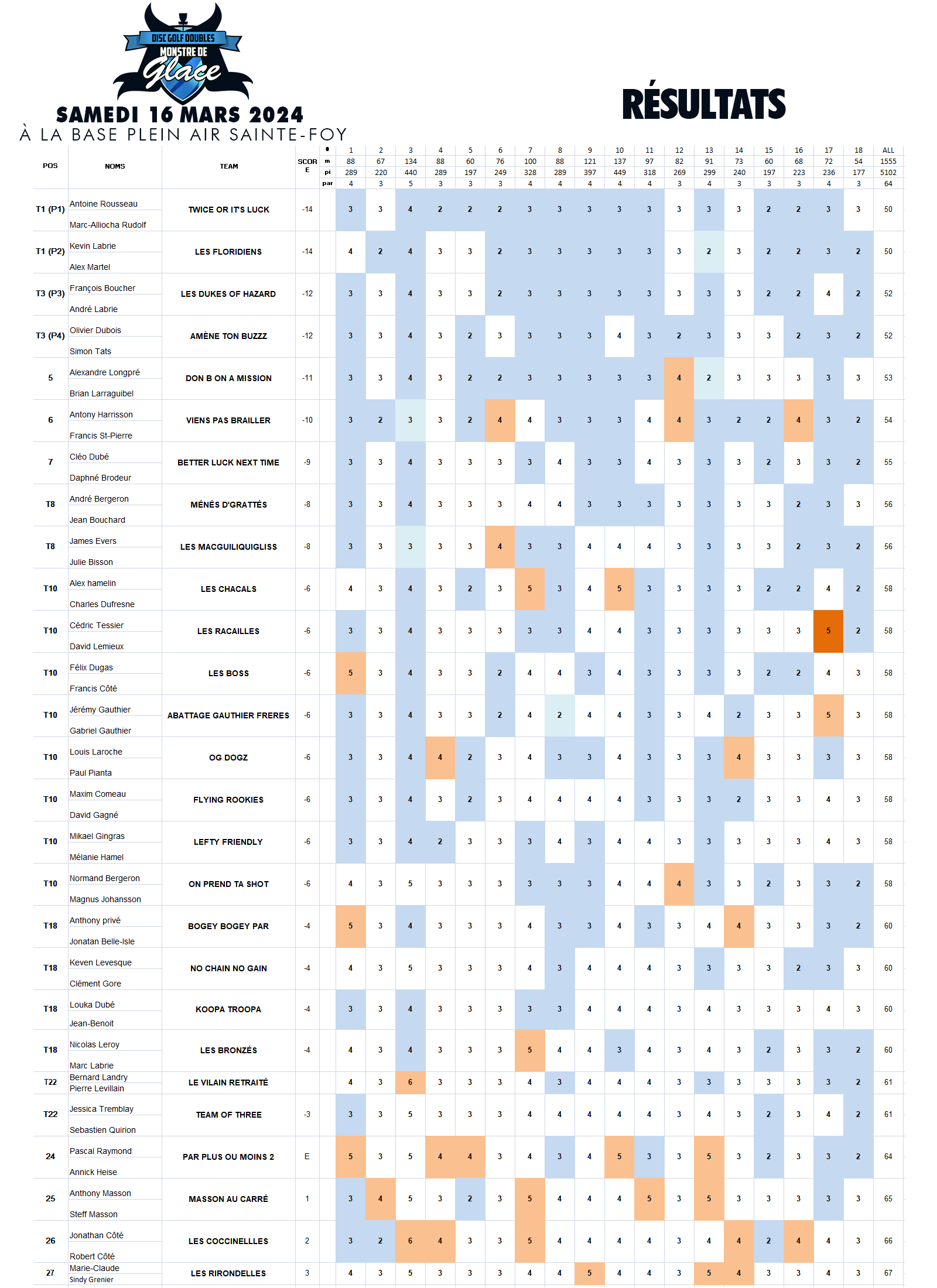 Tarif : 40$+tx / duo1 ronde de 18 paniers en départs simultanés (shotgun)
